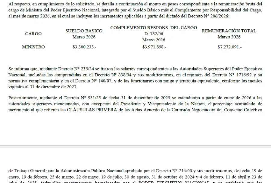 El documento, elaborado por la Dirección Nacional de Sistemas y Estadísticas de Empleo Público y Política Salarial, deja en claro que este esquema alcanza a todos los ministros, al jefe de Gabinete y a las autoridades superiores del Poder Ejecutivo comprendidas en distintos regímenes (decretos 838/94, 1716/92 y 140/07), es decir, secretarios, subsecretarios y funcionarios con rango equivalente. La actualización salarial fue consecuencia directa del decreto 931/2025, firmado por el presidente Javier Milei el 31 de diciembre de ese año, que trasladó a la cúpula del Ejecutivo los aumentos acordados en las paritarias estatales de 2024 y 2025 . De esta norma están exceptuados Javier Milei y la vicepresidenta, Victoria Villarruel, que siguen con sus sueldos congelados.